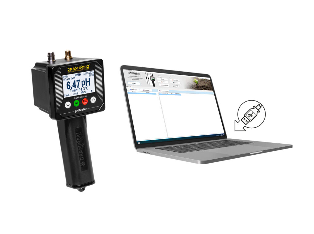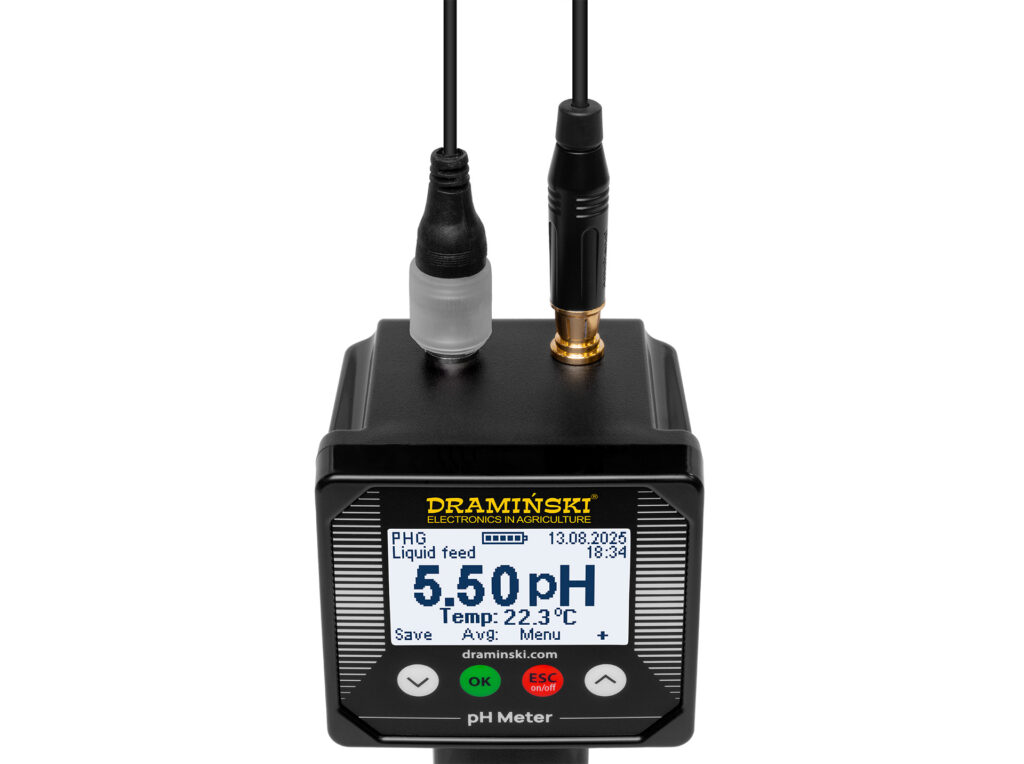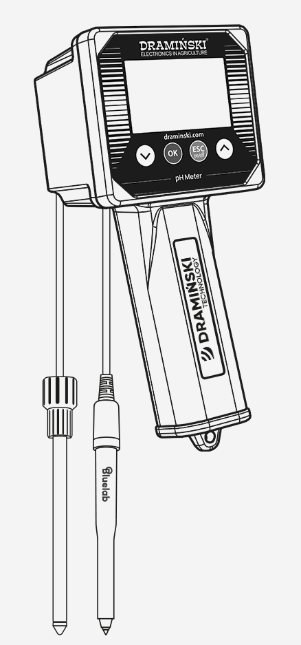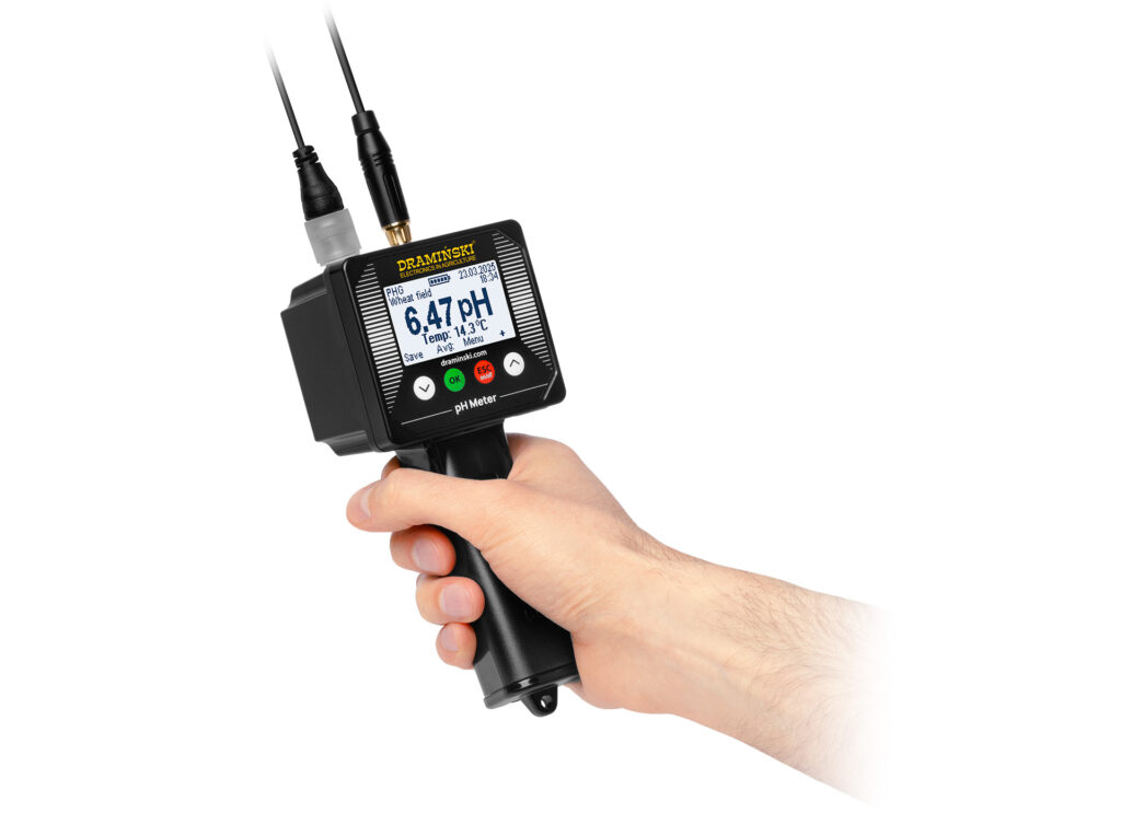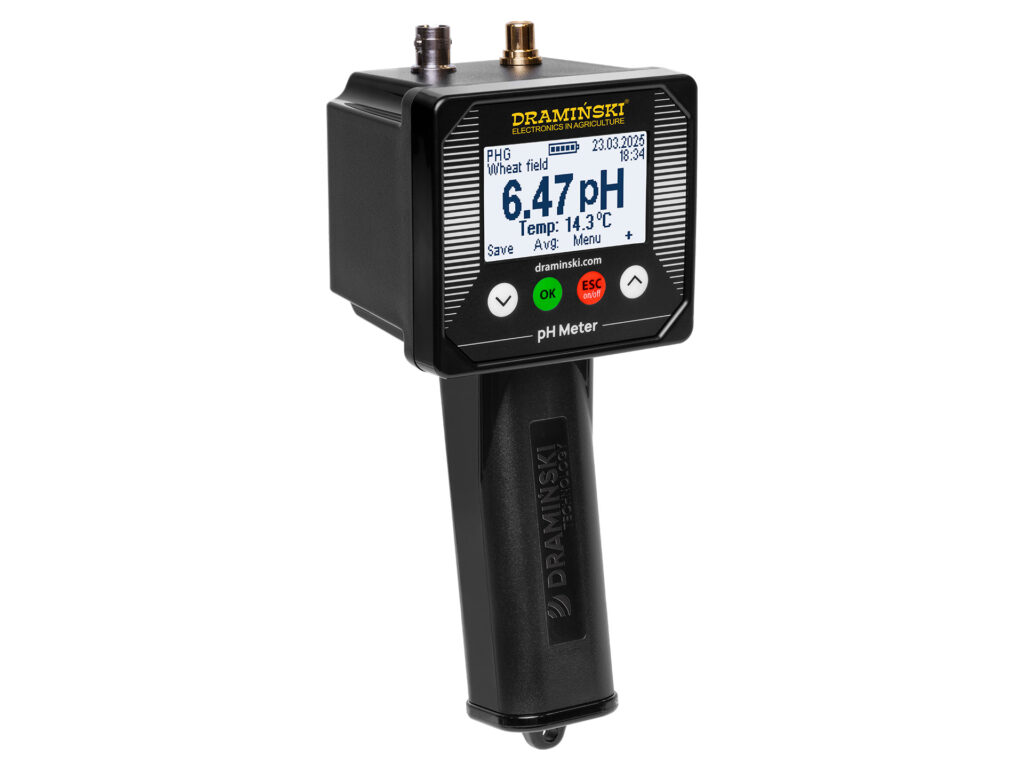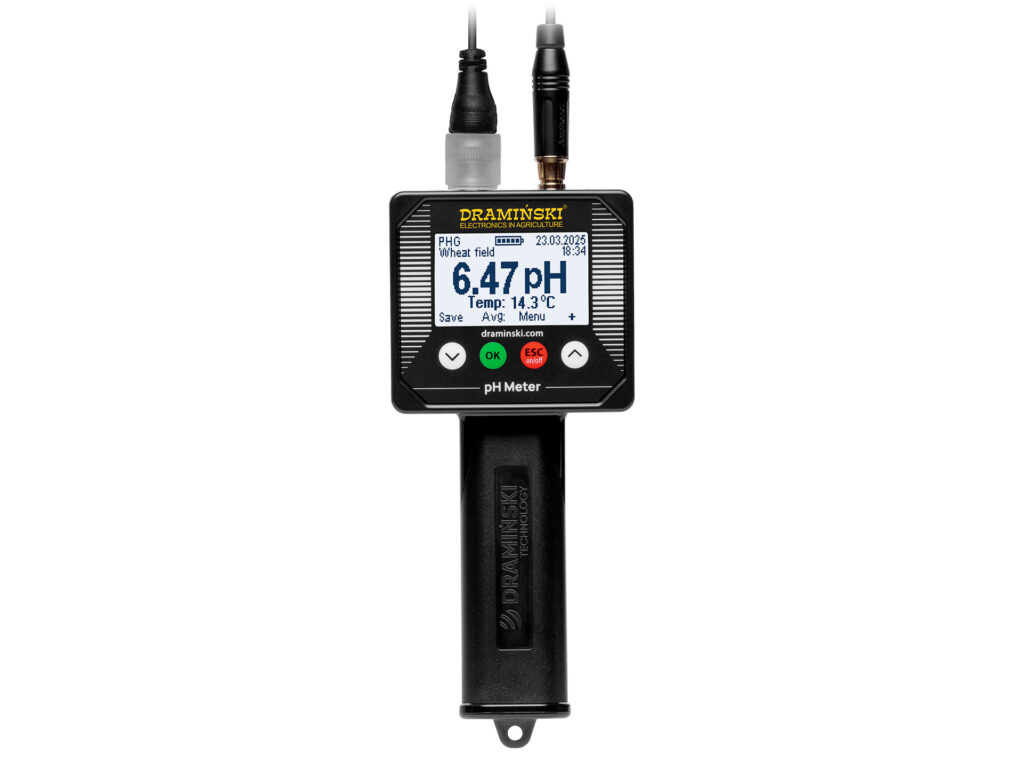 The second-generation Dramiński PHG digital pH meter for soil and liquids (e.g., feed) is a professional and essential tool in various industries. It allows you to quickly and accurately check the concentration of hydrogen ions expressed in pH units. Additionally, it measures voltage (mV) and temperature (°C/°F). The PHG2 is based on a device that has successfully served our clients since 1996. The new model maintains the accuracy and durability of its predecessor while featuring a large backlit display, user-updatable software, a multilingual menu with device settings, tool-free battery replacement, battery charge indicator, built-in memory for storing numerous measurements with date and time, free software for further data analysis on a computer, and the ability to catalog data by entered object names. All this and more is contained in the Dramiński PHG2 pH meter, making it a reliable, versatile device with a measurement accuracy of ±0.05 pH that is worth investing in and enjoying for many years!