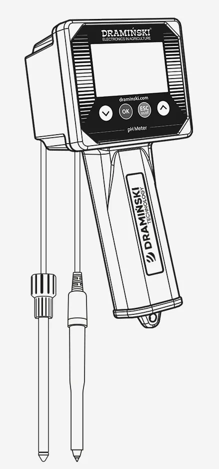 The second-generation Dramiński PHG digital pH meter for soil and liquids (e.g., feed) is a professional and essential tool in various industries. It allows you to quickly and accurately check the concentration of hydrogen ions expressed in pH units. Additionally, it measures voltage (mV) and temperature (°C/°F). The PHG2 is based on a device that has successfully served our clients since 1996. The new model maintains the accuracy and durability of its predecessor while featuring a large backlit display, user-updatable software, a multilingual menu with device settings, tool-free battery replacement, battery charge indicator, built-in memory for storing numerous measurements with date and time, free software for further data analysis on a computer, and the ability to catalog data by entered object names. All this and more is contained in the Dramiński PHG2 pH meter, making it a reliable, versatile device with a measurement accuracy of ±0.05 pH that is worth investing in and enjoying for many years!